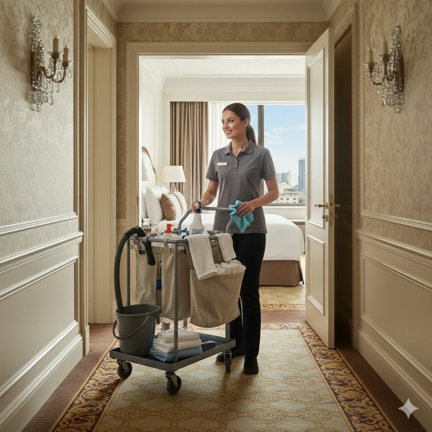 Obsługa pokoi gościnnych: Kompleksowe sprzątanie pokoi po wyjeździe gości (wymiana pościeli, ręczników, odkurzanie, mycie łazienek).